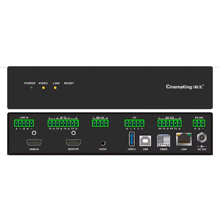 1. 信号接口:拥有HDMI输入接口*1,1路HDMI环出接口*1,5针凤凰端子平衡立体声输入*1,红外接口*4,继电器RELAY接口*2,电平I/O接口*4,串口RS-232接口*2,串口RS-485接口*1,SFP fiber接口*1,RJ-45千兆网口 *1,USB AF3.0接口*1,USB BF2.0接口*1;