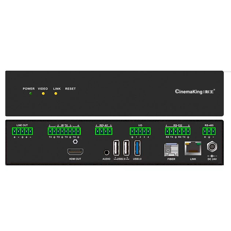 1. 信号接口:拥有HDMI输出接口*1,5针凤凰端子平衡立体声输出*1,IR接口*4,继电器RELAY接口*2,I/O接口*4,RS-232接口*2,RS-485接口*1,SFP fiber接口*1,RJ-45接口*1,USB AF3.0接口*1,USB AF2.0接口*2;