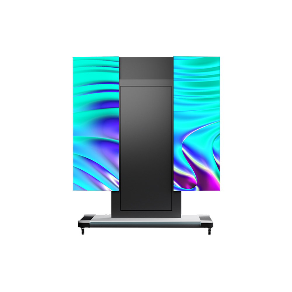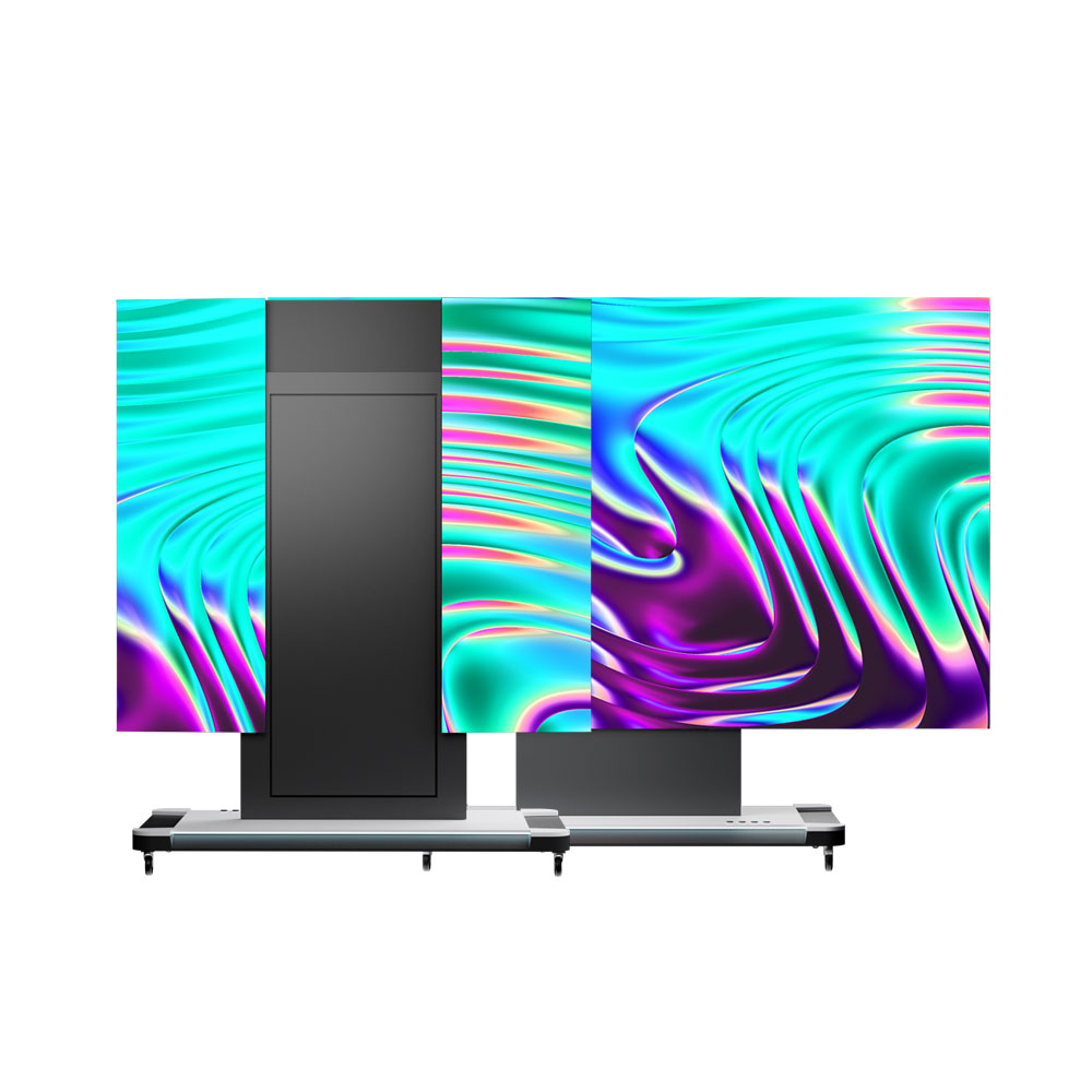 屏体两侧采用向后折叠技术,可向后内折180°,便于整体轻松进入电梯运输。 屏体可实现90cm防碰撞升降,可根据不同使用场景自由调整高度,折叠屏2分钟 内可完成开箱操作,高效便捷。 箱体采用优质压铸铝材质,单箱体重量仅4.5kg,厚度仅31mm。