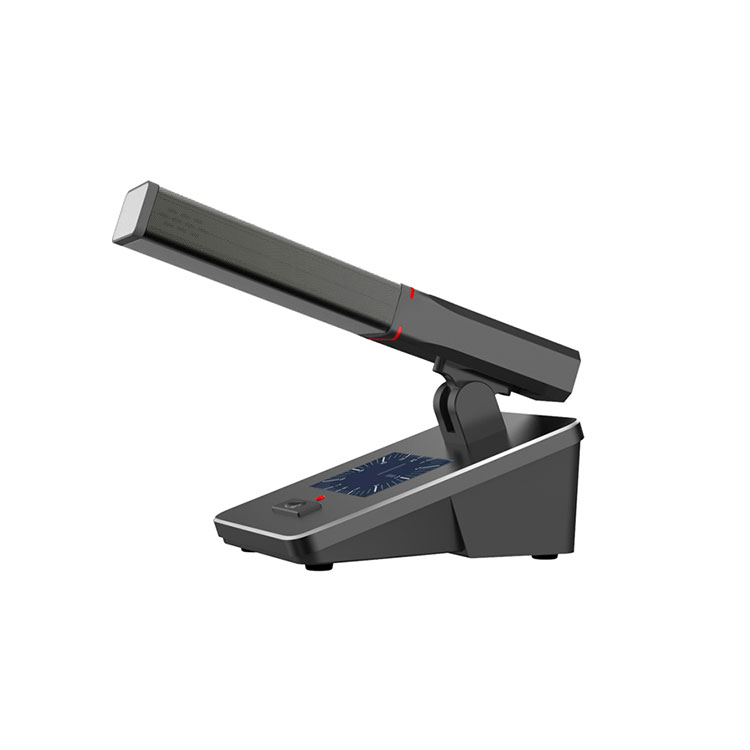 该系列会议话筒专门服务于高端会议市场,采用双备份的设计思路,一路幻象供电话筒音频通道,一路是会议系统音频通道,两套话筒链路完全独立。话筒采用短咪杆,高灵敏度设计,外观简洁大气,话筒咪芯部分采用橡胶避震材料,尽可能的避免的台面噪声对话筒拾音的影响,话筒的另一大特色是在话筒上部增加一块高分辨率的TFT显示屏,分辨率为480*320的方形屏幕。不仅可以满足正常的发言管理。还支持图片显示,话筒请求服务功能,可以根据实际会议情况显示指定的图片,同时可以根据会场需求。话筒的外观造型上采用金属氧化面板,简洁硬朗的外观设计表现出简约庄重的会议设备风格。
