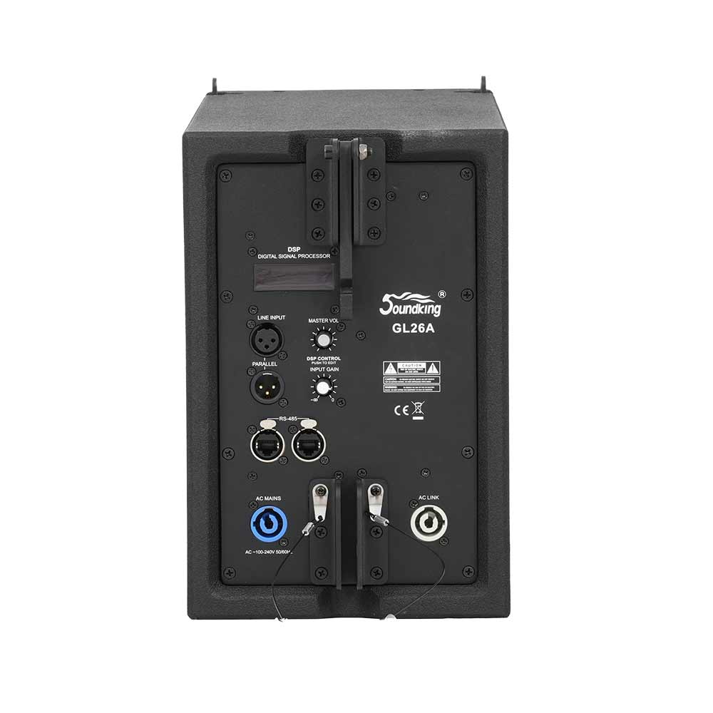 GL26A线阵列音箱提供70Hz-20KHz的频率范围,具备平滑的频率和相位响应。8个1寸的钕磁球顶高音扬声器和2个6.5寸钕磁中低音扬声器构成一个动态余量极大的组合,高音扬声器同轴阵列式排布在中低音扬器上方,声像定位更准,提高线阵列音箱的远场声场均匀度和清晰度。音箱内装一个独立的大功率功放及DSP,音箱可单独调节,连接数量根据实际场合大小进行配置,使得现场扩声极其灵活、便捷。