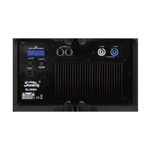 2. GL26SA功放部分使用高效率开关电源,内置DSP模块,具有处理分频、EQ、压限、延时、音量等功能,DSP可通过面板简易操作,功放面板上带有RS485网络接口;1200W大功率的单15寸有源超低频音箱GL26SA,可增强系统低频下限;