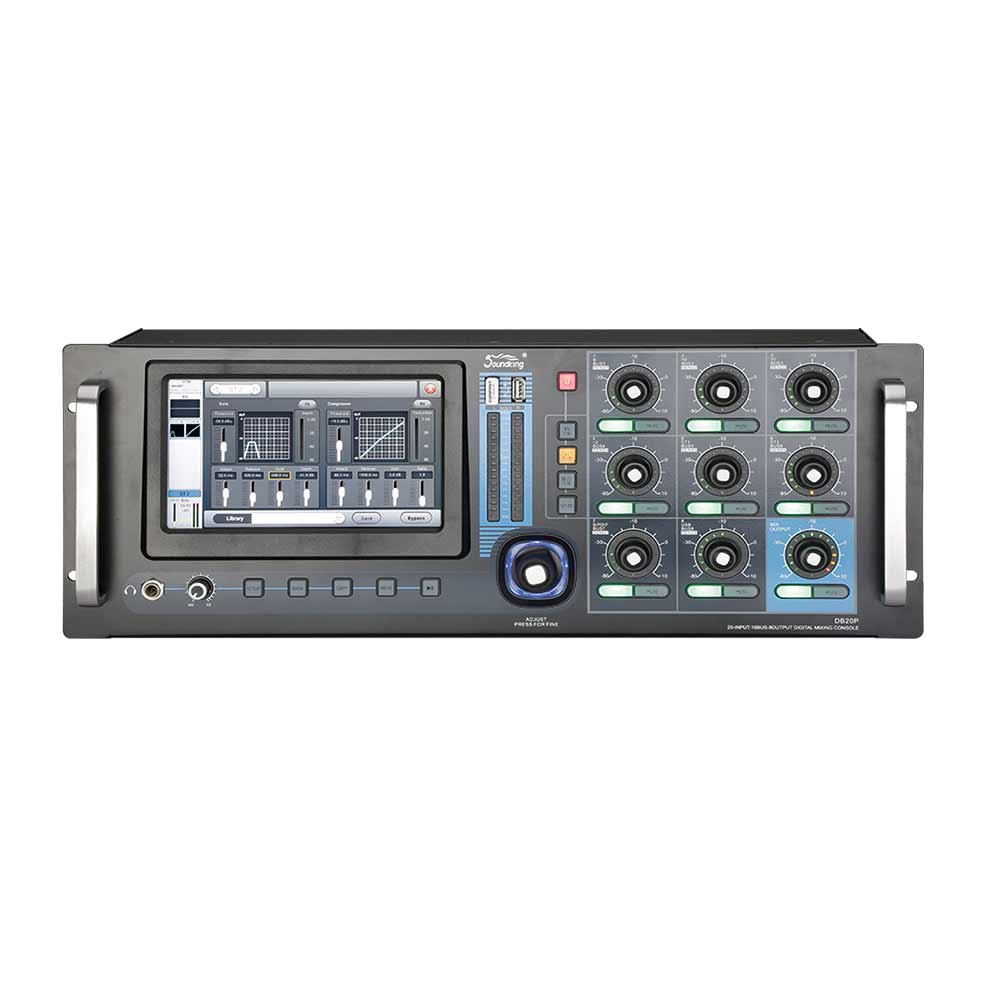 DB20P机架式系列数字调音台,19”标准机架安装。它融合了现代数字调音台和传统箱式调音台的全新理念。它小巧的身材,简单的操作界面,专业的混音效果,既能够在一场专业人士演出上发挥出色的能力,也能给充分满足经验不足的个人用户提供强大的效果。DB20P数字箱式调音台具有压限器,效果器,分频器,均衡器,以及常规模拟调音台的功能,可以为客户节省大量费用。DB20P综合了高端硬件/触摸滑控和iPad平板遥控操作的优势。 采用了第四代40位SHARC浮点处理器,24bit/48kHz模数/数模转换,内置8个效果器,带混响、延时、调制和GEQ。(20个输入通道)包含12路专业麦克风和2路的立体声和专业的数字信号输入端口,16路总线包含8个自定义模拟输出,数字输出端口和一对监听接口。提供给用户多种配置选择,同时DB20P安装有两个USB接口分别用于播放、录音、场景储存和iPad遥控接入。DB20P配备7寸的IPS高清触摸屏,同时可以进行WIFI无线控制,配合10个编码器调整参数,操控直观便捷。