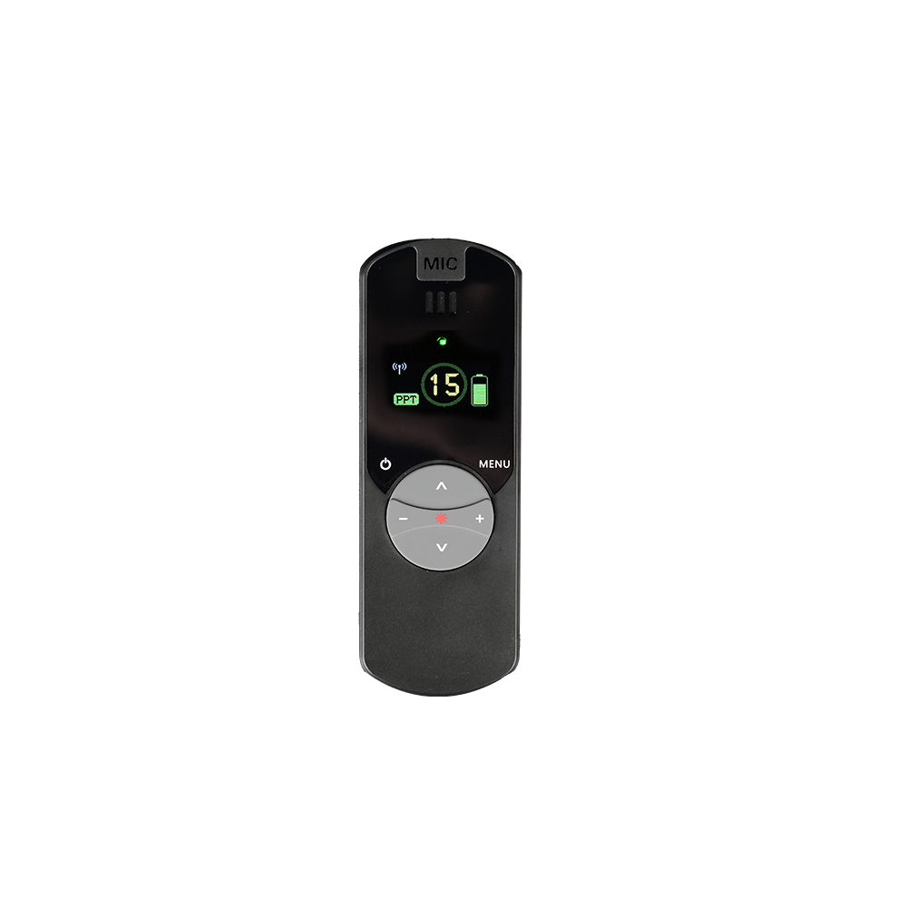采用 OLED 屏显示,可全面显示各种工作信息,包括:信号强度,电量,音量,工作频道,对频方式。