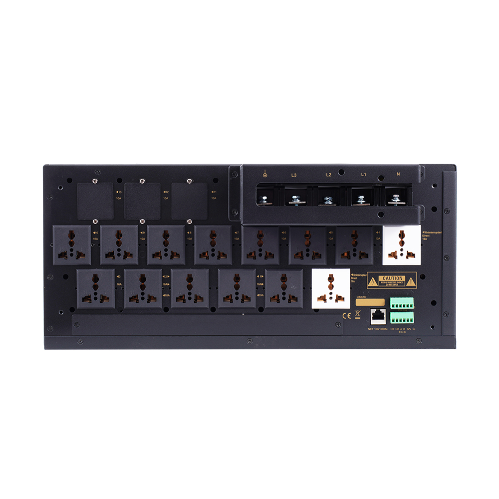 单路输出为16/30A,总输出电流125A,带10路独 立控制多功能插座,2路合并式多功能插座,2路 不间断多功能插座(10A插座 x 11,16A插座 x 3)。