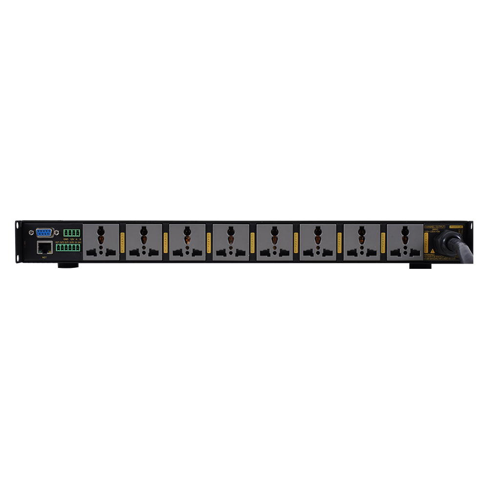 行业内小体积的物联网带检测功能电流电压数据分析电源管理终端,19 寸标准机柜1U 设计;提供8 个电源开 关通道,单通道的最大电流为10A,总输入电流容量为38A;另外提供1个不间断电源插座和1个1.5A的USB输 出口;前面板提供1 个LCD高清数显液晶屏, 可查看回路参数;具备特定4个EMI滤波器;自带强大本地和远程 管理平台,实现多数据实时互通互控;特定权限管理,让效率更高,信息更安全。