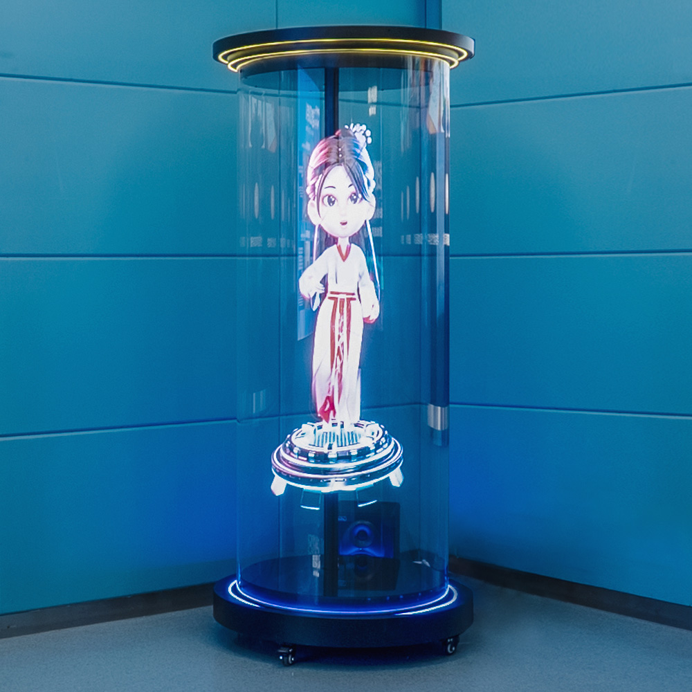 全息风扇屏快速旋转成像,形成空中悬浮的裸眼3D效果,相比其他显示类产品,通透率提高 60%、耗电节省 90%,且可加入互动系统智能化环节。既为全息3D数字人提供了清晰的显示效果又大大解决了显示器高成本问题。