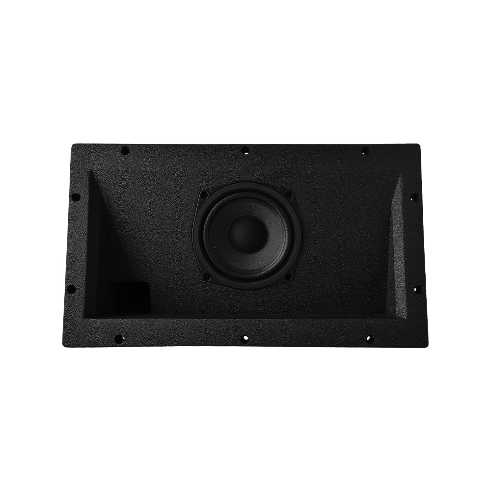 FCD05HL是一款5”二分频无源同轴音箱,音色清晰明亮、厚实饱满、功率大、失真小。音箱采用二分频无源同轴设计,内置1个5寸同轴喇叭,喇叭朝下倾斜15度,用于侧墙安装扩声使用时,可朝下均匀覆盖声场。音箱采用超薄设计,深度仅140mm,适合隐藏式安装使用,节省墙体内部空间。音箱箱体四周留有20mm边及螺钉孔,隐藏式固定安装使用时用于固定音箱。音箱箱体采用俄罗斯桦木夹板制作,喷砂粒漆外罩细砂聚脲防水黑漆。